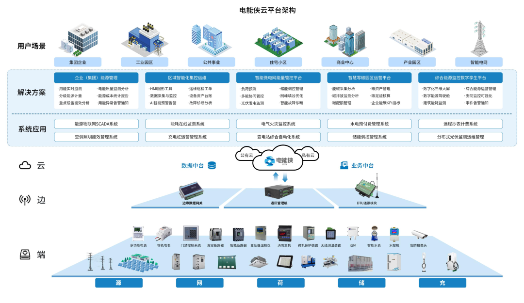 基于上万家各类场景企业用电服务案例和十余年电力数字化的软件研发积累,苏文电能数字能源事业部应用物联网、大数据和人工智能等技术,打造电能侠云平台,致力于构建全国能源互联网,实现用能场景、风、光、储、充等设备互联互通。