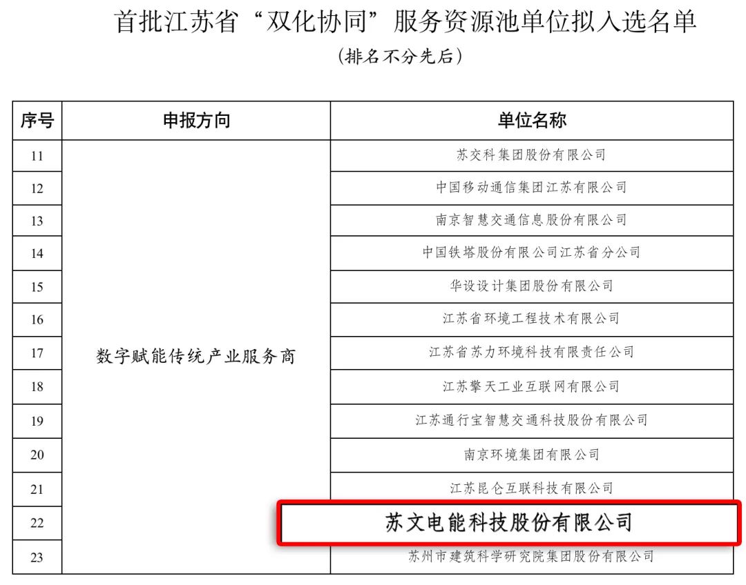 近日,省委网信办会同各相关单位,联合组织开展了江苏省“双化协同”服务资源池单位征集活动。经各地各有关部门推荐、形式审核、专家评审和综合审议,苏文电能科技股份有限公司成功入选。