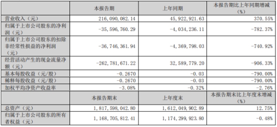 致远新能2023年第一季度实现营业收入2.16亿元,同比增长370.55%;归属于上市公司股东的净利润为-3559.68万元,上年同期为-403.42万元,同比下降782.37%;归属于上市公司股东的扣除非经常性损益的净利润为-3674.64万元,上年同期为-436.98万元,同比扩大740.92%。
