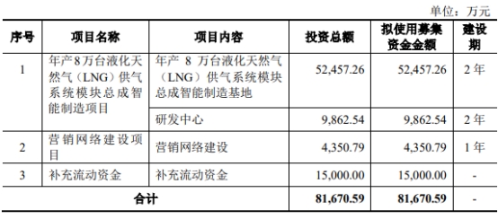 致远新能本次发行募集资金总额为83,000.17万元,扣除发行费用后,募集资金净额为77,735.17万元。致远新能2021年4月23日发布的招股书显示,公司拟募集资金81,670.59万元,用于年产8万台液化天然气(LNG)供气系统模块总成智能制造项目、营销网络建设项目、补充流动资金。
