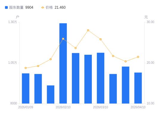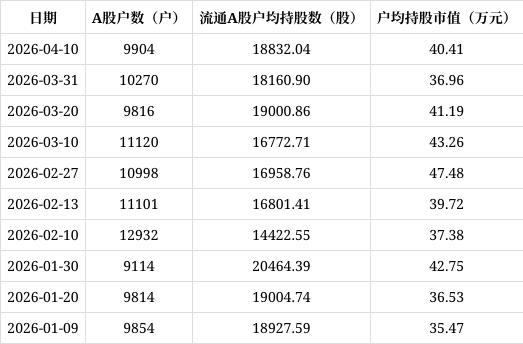 4月14日消息,数据显示,截至2026年4月10日,致远新能A股股东总户数为9904户,较上期(2026年3月31日)减少366户,降幅3.56%。公司最新A股总股本为1.87亿股,其中流通A股1.87亿股,户均持有流通A股数量为1.88万股,较上期增加671.13股,增幅3.70%;户均持流通A股市值40.41万元,较上期增加3.46万元,增幅9.35%。