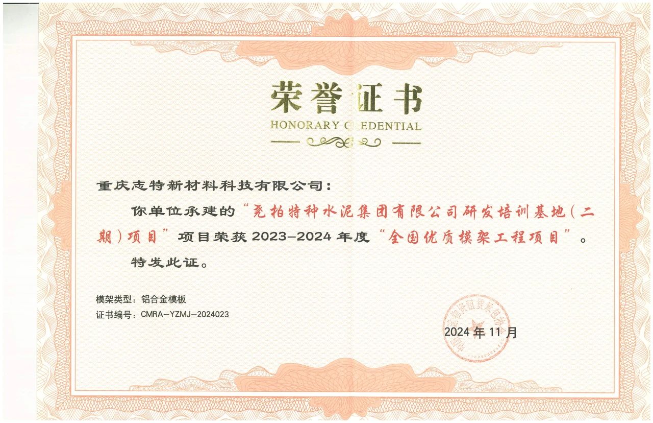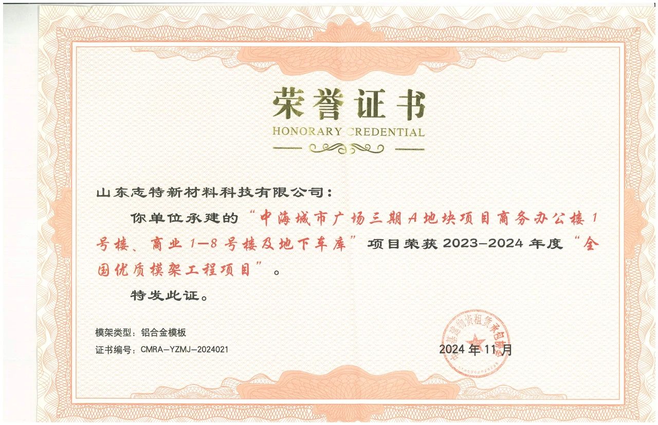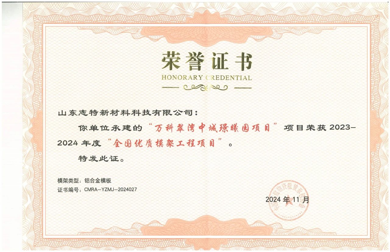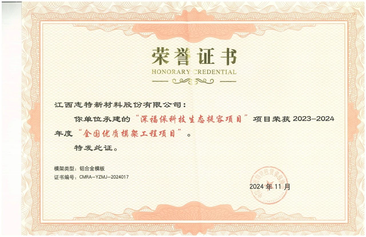 志特新材本次荣获“模板脚手架租赁特级企业”及“2024年度质量服务品牌企业”,承建的深福保科技生态提容、万科翠湾中城璟曦园、西安尧柏特种水泥集团有限公司及中海城市广场三期A地块分别荣获“优质模架工程项目”。