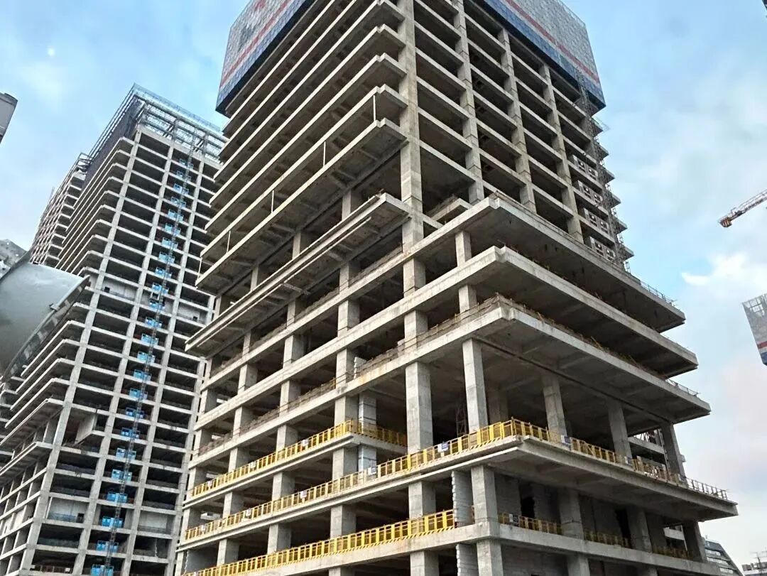 作为备受瞩目的重点工程,其施工过程面临多重挑战:几栋超高层主楼均存在“大悬挑结构”,其中A01塔楼的大悬挑部位位于近百米高空,悬挑长度达4米;同时,项目紧邻居民小区,对安全文明施工的要求极高。志特施工团队通过科学规划材料堆场布局、精准制定百米高空大悬挑结构施工方案,成功攻克各项难点,确保工程各节点顺利推进,为主体结构封顶奠定了坚实基础。