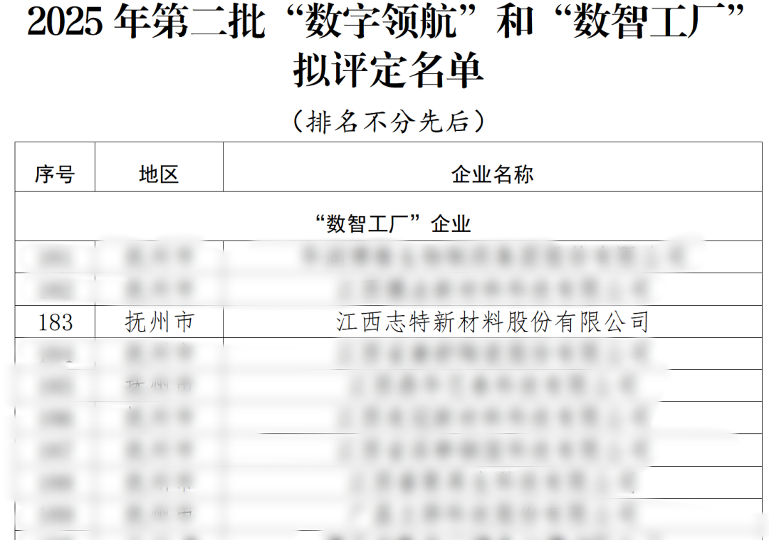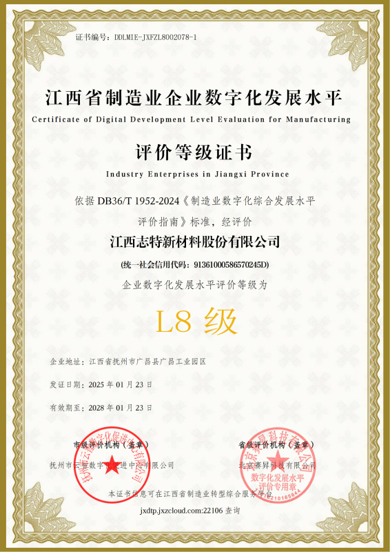 近日,志特新材(股票代码:SZ 300986)凭借在数字化领域的深度实践与显著成效,荣获江西省“数智工厂”认定。这是继今年4月公司获评“数字化转型L8贯标奖”后在数字化转型道路上获得的又一重要省级荣誉。该奖项由江西省工业和信息化厅主导评定,标志着企业在智能制造能力成熟度、数字技术融合应用等维度达到行业领先水平。