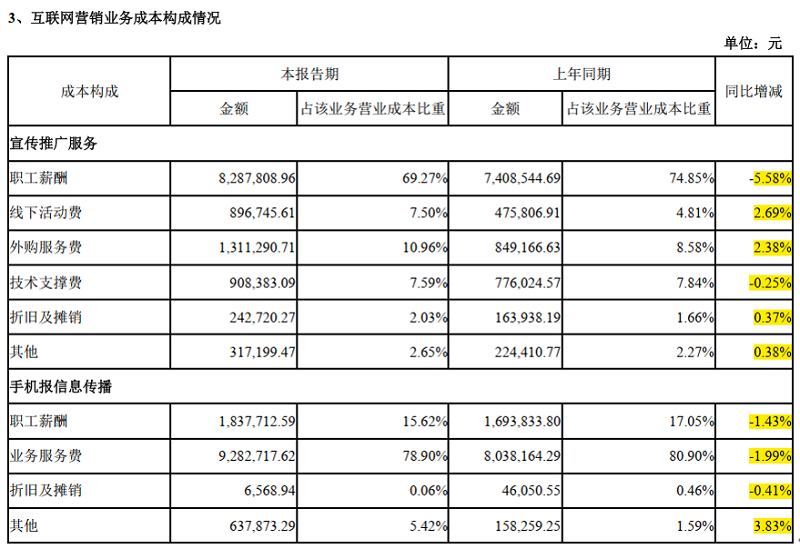 半年报显示,互联网营销业务成本由两部分组成——宣传推广服务和手机报信息传播,具体金额如下表所示:
