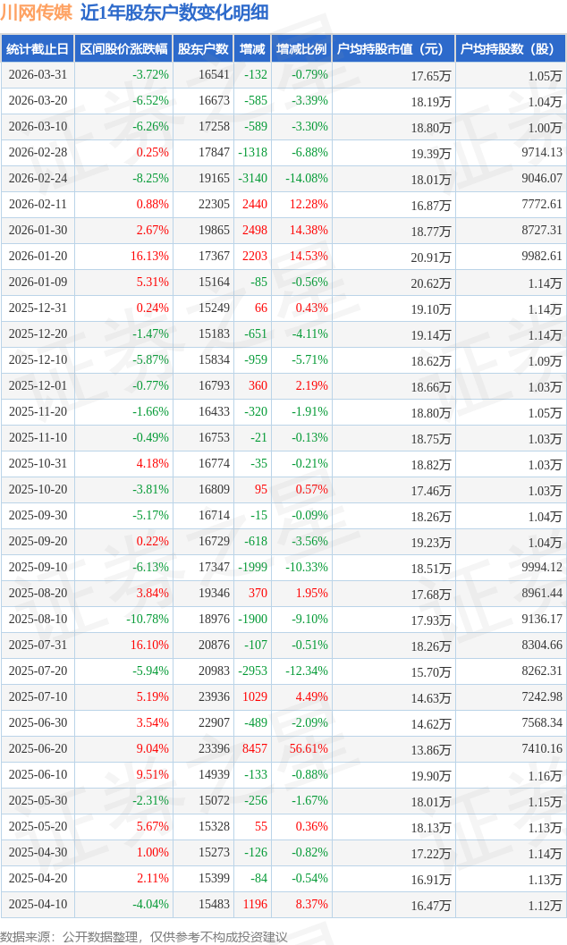 从股价来看,2026年3月20日至2026年3月31日,川网传媒区间跌幅为3.72%,在此期间股东户数减少132.0户,减幅为0.79%。