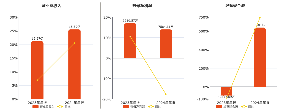 公司营业总收入为18.39亿元。归母净利润为7584.31万元,较去年同报告期归母净利润减少1626.25万元,同比较去年同期下降17.66%。经营活动现金净流入为1.81亿元。