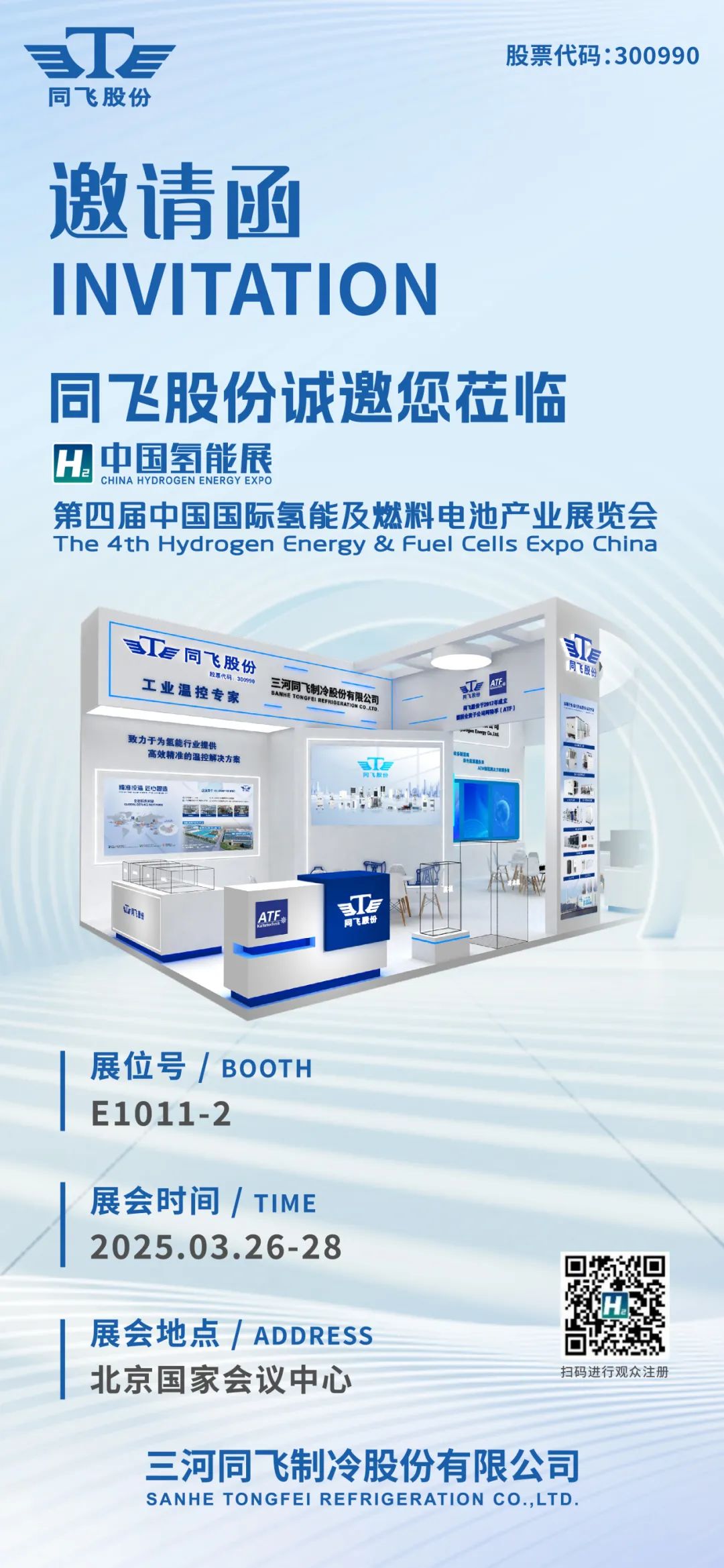 同飞股份将亮相"2025中国国际氢能及燃料电池产业展览会(CHEE)",展会将于2025年3月26日-28日在北京国家会议中心举行,诚邀您莅临E1011-2展位参观交流。同飞股份携多产温控产品护航能源安全,致力于为氢能全产业链提供稳定可靠的温控解决方案,助力新型能源体系建设,推动绿色低碳发展。