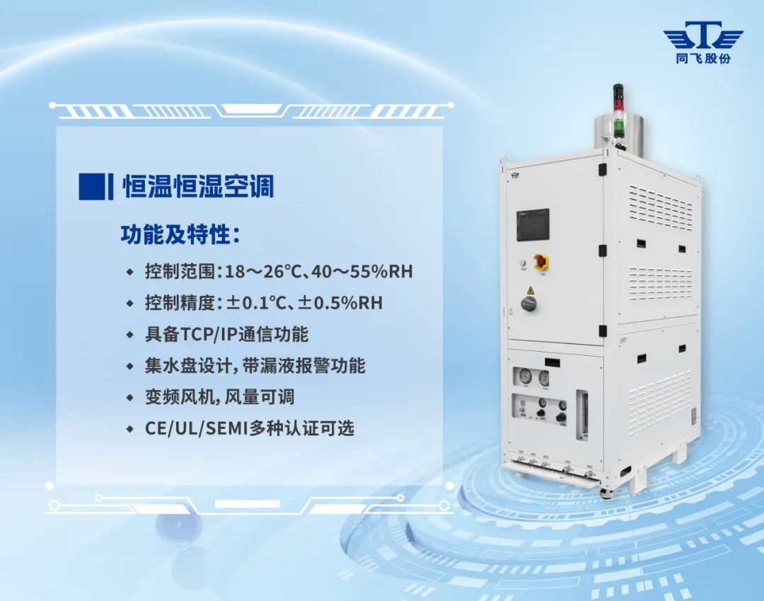而恒温恒湿空调作为同飞股份在本次展会全新发布的产品,以其强大的环境调控能力,为半导体生产过程营造出恒温恒湿的理想环境,减少了外界因素对制造过程的干扰,全方位守护半导体制造的各个环节。