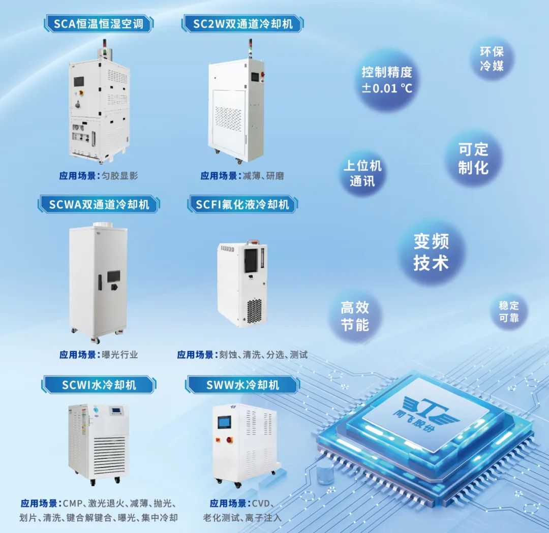 同飞股份凭借在工业温控技术的深厚积淀,为半导体制造设备量身定制了精准而高效的温控解决方案。其产品矩阵涵盖了恒温恒湿空调、氟化液冷却机、双通道冷却机、水冷机组及特种换热器,每一款产品都凝聚着同飞股份对技术创新的执着追求与对品质的严苛坚守。