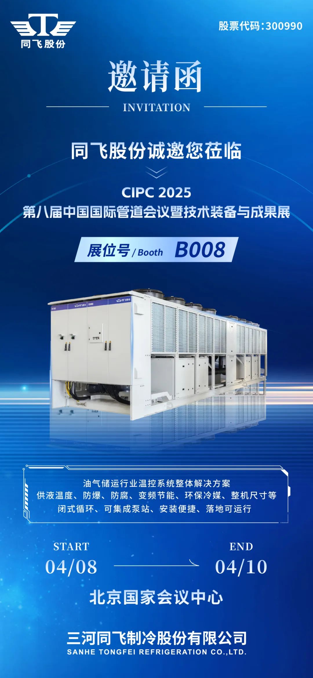 同飞股份将亮相"第八届中国国际管道会议暨技术装备与成果展(CIPC 2025)",展会将于2025年4月8日-10日在北京国家会议中心举行,诚邀您莅临B008同飞展位参观交流。同飞股份将携油气储运行业温控系统整体解决方案亮相展会现场,赋能产业升级。