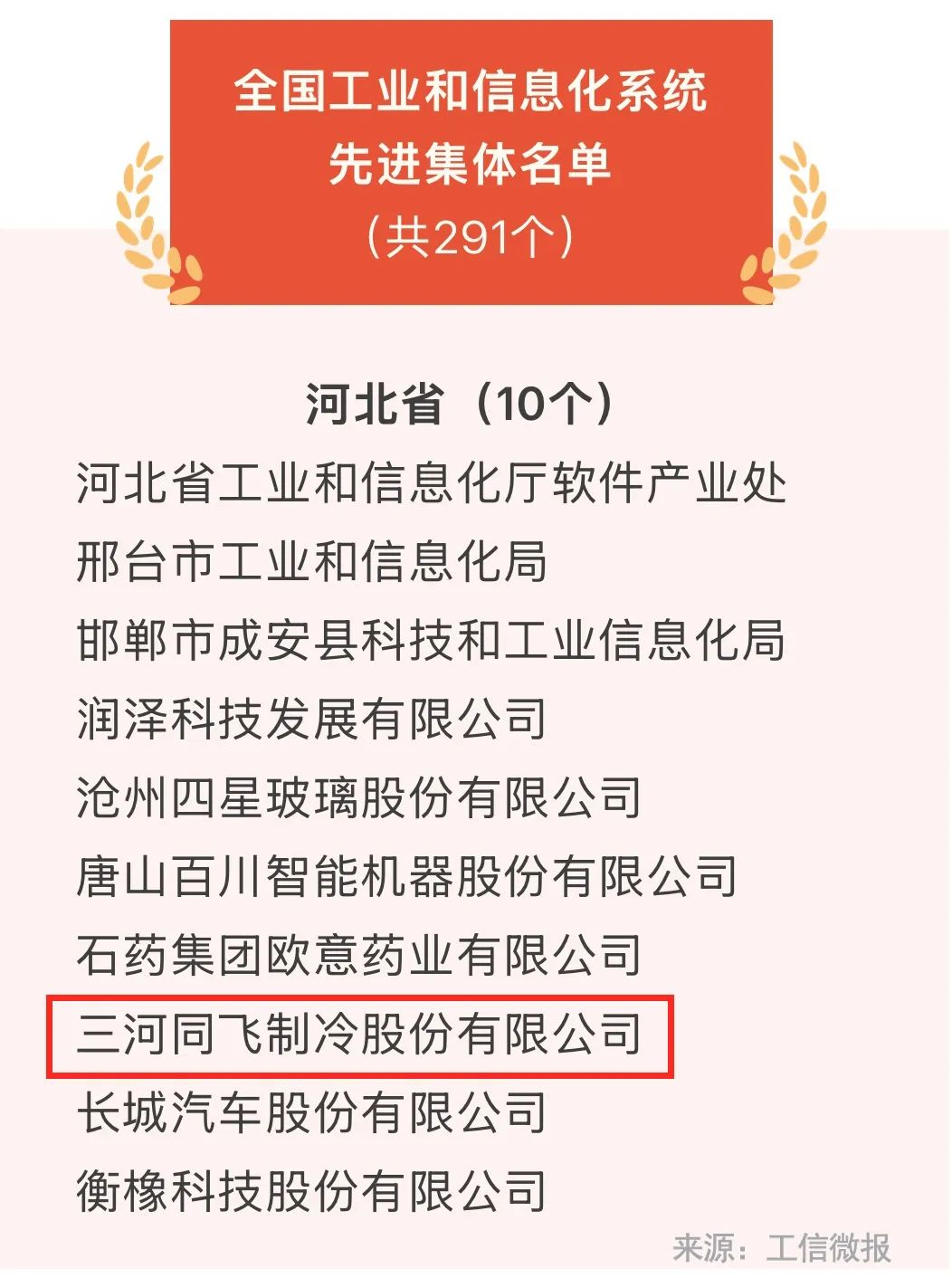近日,工业和信息化部发布了全国工业和信息化系统先进集体、劳动模范、先进工作者表彰名单,河北省共10家单位获授该项殊荣,三河同飞制冷股份有限公司上榜。这是对同飞股份在工业领域杰出贡献的高度肯定!