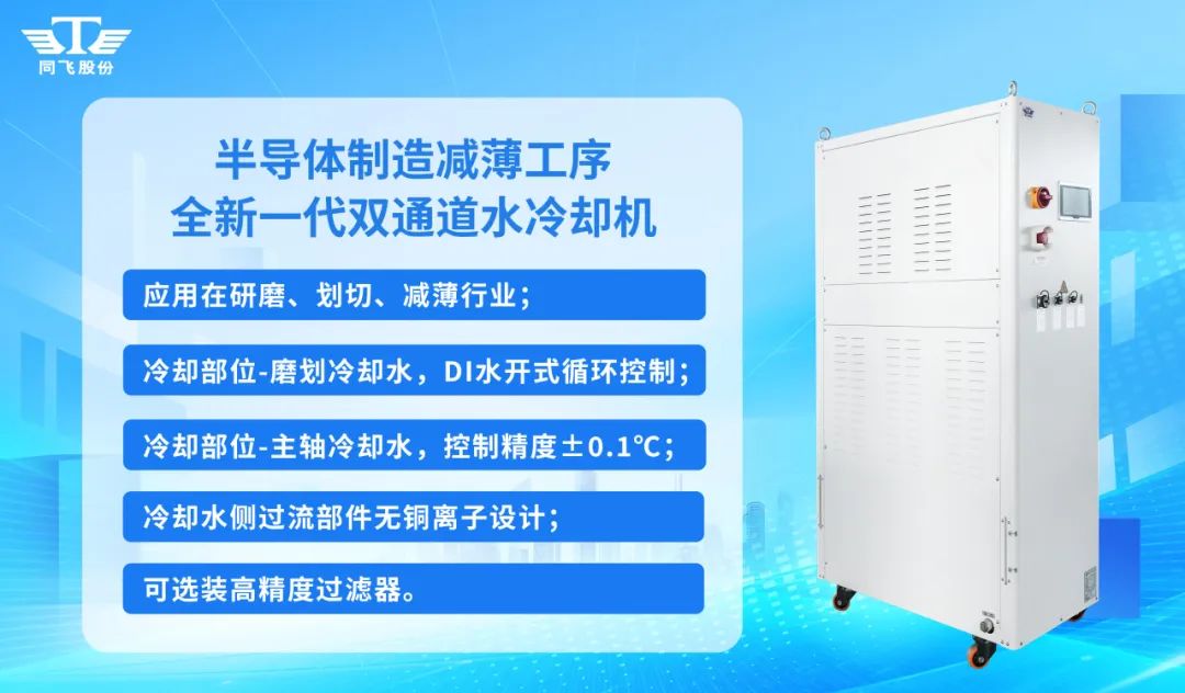 在半导体加工制造领域,随着芯片制造工艺的日益精细化,对加工设备的冷却系统提出了更高的要求。研磨、划切、减薄等工序是半导体制造中不可或缺的环节,而高效的冷却技术在这其中发挥着关键作用。同飞股份全新一代双通道水冷却机应运而生,以卓越的性能和创新的设计,为半导体行业带来冷却解决方案的全新选择。