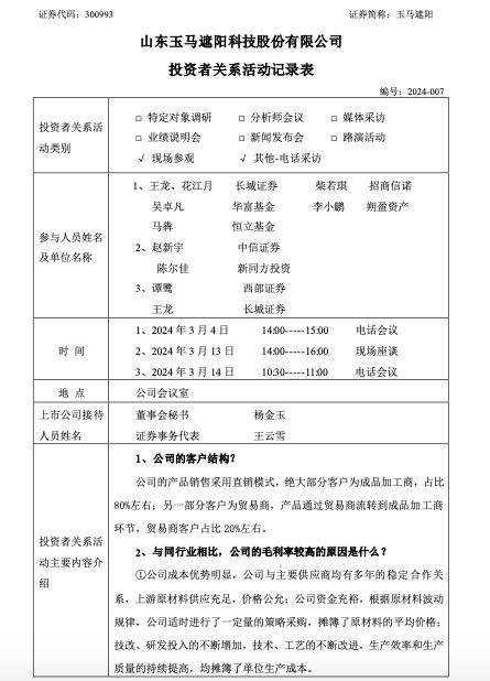 玉马遮阳向投资者介绍了公司的客户结构。公司的产品销售采用直销模式,绝大部分客户为成品加工商,占比80%左右;另一部分客户为贸易商,产品通过贸易商流转到成品加工商环节,贸易商客户占比20%左右。