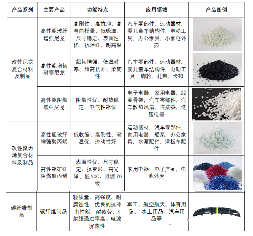 公司的主营业务为改性尼龙(PA)、改性聚丙烯(PP)、聚苯硫醚(PPS)为主的高性能高分子复合材料及其制品、精密注塑模具、碳纤维制品的研发设计、生产和销售及相关服务。通过塑胶成型一体的差异化服务,为客户提供最优化的新材料解决方案和増值服务。
