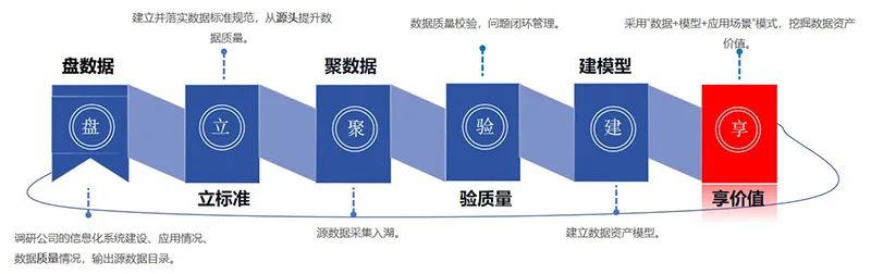 “盘数据、立标准、聚数据、验质量、建模型、享价值”,是基于业内领先实践经验结合公司众多数据治理项目后总结的一套行之有效、可复用的数据治理实施路径。