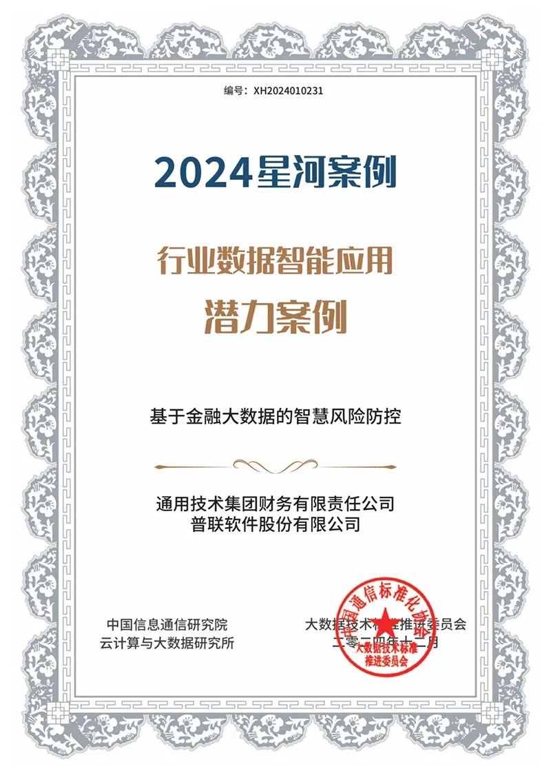 2024年12月18日,2024数据资产管理大会在北京召开,第八届大数据“星河(Galaxy)”案例评选结果隆重揭晓。普联软件与通用技术财务公司联合申报的《基于金融大数据的智慧风险防控》案例经过初评、专家答辩和大众投票,从730个参赛案例中脱颖而出,荣获大数据“2024星河案例”奖。这是继2024年10月19日《通用技术金融数据魔方》获得“2024 DAMA数据治理最佳实践奖”之后的又一个重磅奖项。