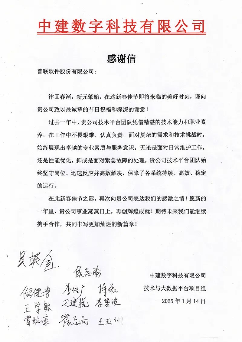 新春佳节将至,在这个充满喜悦与希望的美好时刻,普联软件股份有限公司收到了中建数字科技有限公司发来的感谢信,信中高度赞扬了普联软件技术平台团队的专业素质和服务意识。