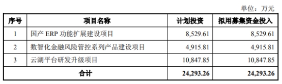 本次发行的可转债所募集资金总额不超过24,293.26万元(含本数),扣除发行费用后拟用于以下项目:国产ERP功能扩展建设项目、数智化金融风险管控系列产品建设项目、云湖平台研发升级项目。