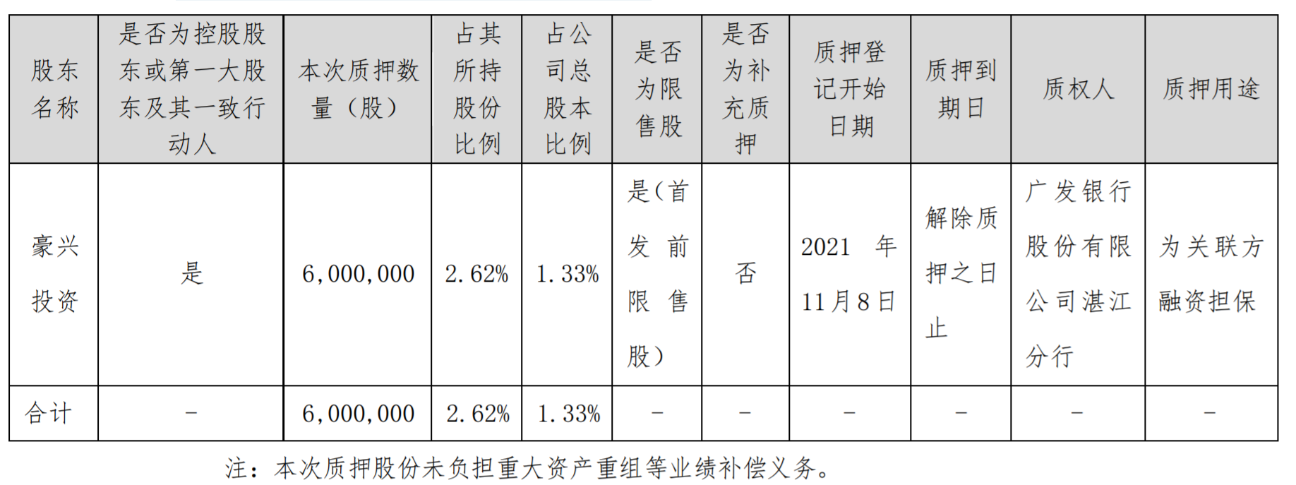 公告显示,欢乐家近日接到控股股东广东豪兴投资有限公司(以下简称“豪兴投资”)通知,获悉豪兴投资将其所持有欢乐家的600万股股份进行质押,占其所持股份比例为2.62%,占欢乐家总股本比例为1.33%。