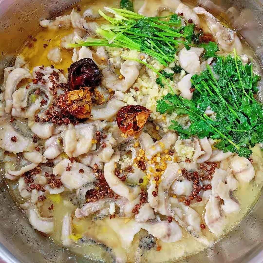 在另一边,我们起锅烧水,将豆芽和木耳焯水断生后放在一旁的鱼骨上,再次起锅烧金龙鱼玉米油,开始炒佐料啦,放入葱、姜、花椒、麻椒和豆瓣酱,小火慢炒,将佐料炒出香味后将熬好的鱼汤放入锅中,两分钟后将料渣捞出放入鱼肉、盐、胡椒粉、味精,这时,大家不要用铲子搅动鱼肉,等两分钟后鱼肉成熟,将其倒入鱼骨和豆芽、木耳之上,放入葱花,这样,一份少金龙鱼玉米油的水煮鱼就做好啦。