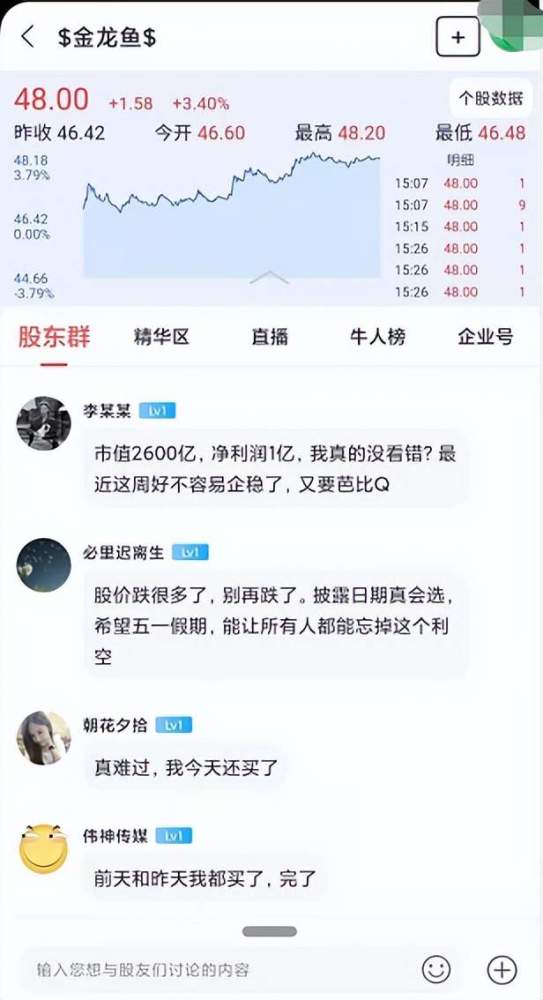 对于这样的业绩表现,在尺度金龙鱼股东群,有股民表示难以置信,“市值2600亿,净利润1亿,我真的没看错?最近这周好不容易企稳了,又要芭比Q?”