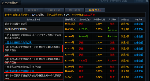 林园曾看好金龙鱼。2021年一季度末,林园旗下多只基金持仓金龙鱼,其中林园投资24号私募投资基金是第10大流通股东,持94.96万股。林园投资166号私募证券投资基金是第5大流通股东,持仓133.21万股。