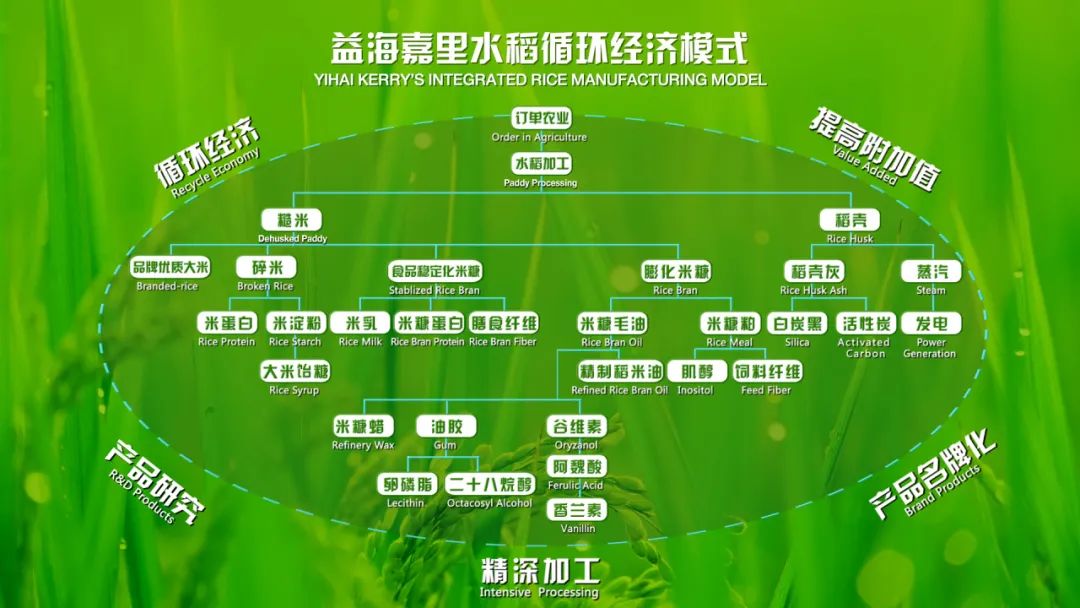 经过多年潜心研发,益海嘉里金龙鱼开创了集大米生态基地种植、加工、储运、副产品综合利用一体化的“水稻循环经济模式”,满足消费者对大米美味、安全的需求,同时又把每一粒稻谷“吃干榨净”,从副产品和米糠中萃取米糠蜡、谷维素、米粞粉、稻米油等高附加值产品,将其广泛应用于专用油脂、油脂科技、化妆品等行业,实现了水稻的高效转化循环利用和增值。