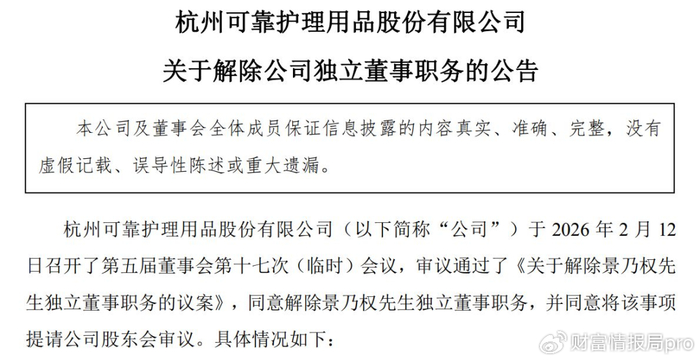 根据公告,解除景乃权独董职务的议案将提交2026年第二次临时股东大会审议,会议定于3月12日召开。届时,拥有表决权的全体股东将对此事做出最终裁决。