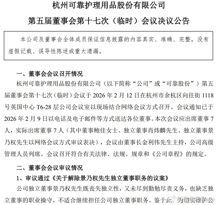 春节刚过,A股市场又上演了一出罕见的上市公司内讧戏码。成人卫生用品龙头企业可靠股份(SZ301009)2月23日晚间公告称,公司董事会以5票同意、2票反对的结果,审议通过了《关于解除景乃权先生独立董事职务的议案》。投下反对票的分别是公司董事鲍佳和当事人景乃权。