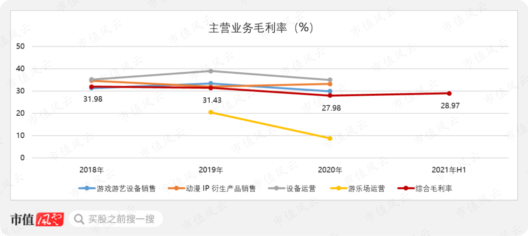 收购后的首年,该业务即贡献收入0.84亿元,占总收入的17%,毛利率约20%。但受疫情影响,2020年2至4月各游乐场暂停营业,全年游乐场运营收入仅0.56亿元。客流锐减加之固定成本占比较高,导致当年毛利率仅不足9%。