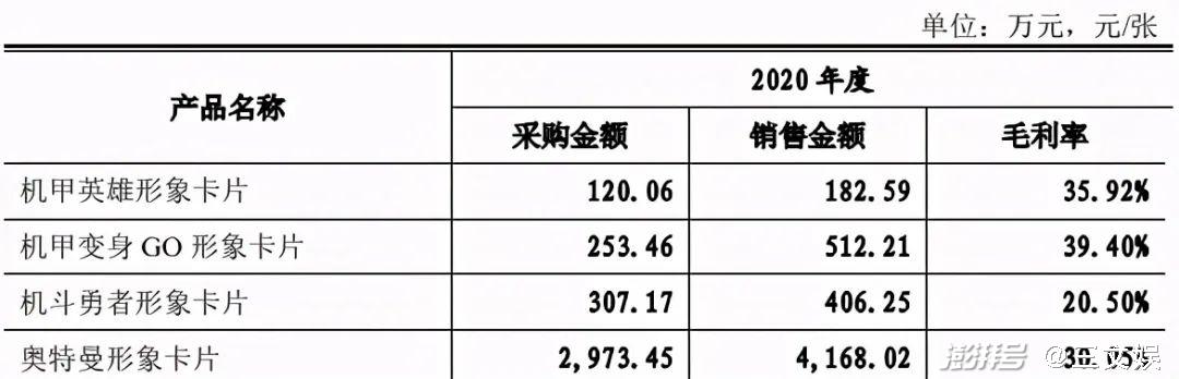 从IP分布看,2020年度华立科技的奥特曼卡、龙珠卡、机甲变身Go卡、机斗勇者卡、宝可梦卡、机甲英雄卡,分别卖出4168.02万、630.22万、512.21万、406.25万、391.27万和182.59万元,成本分别为2973.45万、552.21万、253.46万、307.17万、299.03万和120.06万元,毛利率分别为30.05%、34.97%、39.4%、20.5%、32.77%和35.92%。