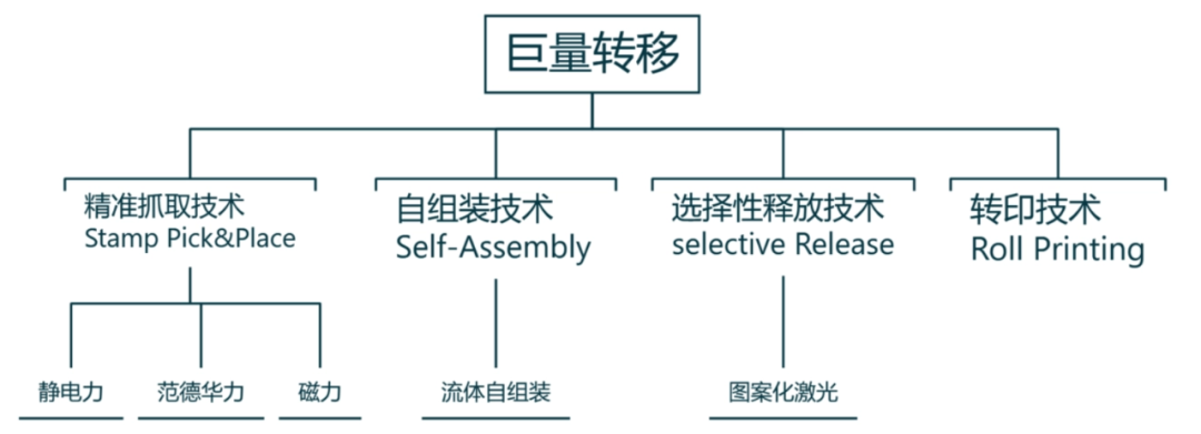 所以巨量转移技术是已被证明能够克服组装MicroLED芯片极端要求的有前途的解决方案,包括激光剥离技术、接触式μTP技术、激光非接触式μTP技术和自流体组装技术等。