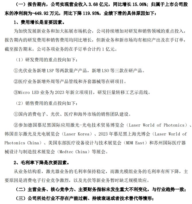 公司主要从事激光器和激光整体解决方案的研发、生产和销售等业务,应用于工业和生物医疗两个重点领域。对于业绩下滑的具体原因,英诺激光认为,1、费用增长是首要因素。公司持续增加对研发和销售领域的重点投入,报告期内的研发费用和销售费用均同比增长,但新业务和新市场均有相应产出及在手订单,截至报告期末,公司各项业务的在手订单合计约 1 亿元。