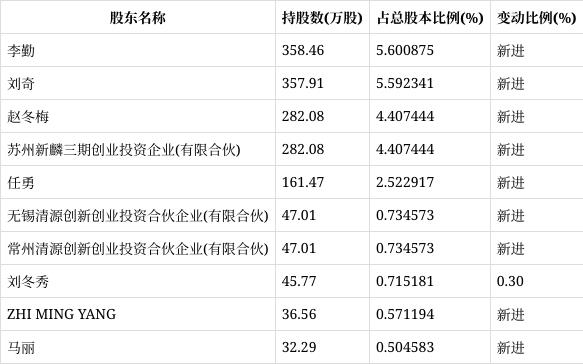 三季报显示,2022年三季度末的公司十大流通股东中,新进股东为李勤、刘奇、赵冬梅、苏州新麟三期创业投资企业(有限合伙)、任勇、无锡清源创新创业投资合伙企业(有限合伙)、常州清源创新创业投资合伙企业(有限合伙)、ZHI MING YANG、马丽。在具体持股比例上,刘冬秀持股有所上升。