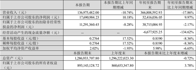 根据三季报,公司第三季度实现营业总收入1.37亿元,同比下降10.74%,环比下降1.92%;归母净利润1769.1万元,同比增长10.18%,环比下降20.54%;扣非净利润1129.14万元,同比下降8.28%,环比下降41.78%。