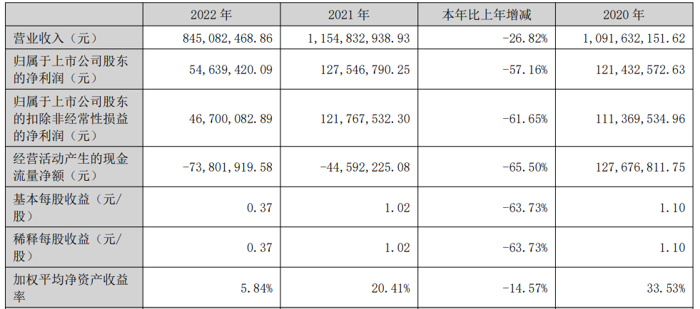 2022年,华蓝集团实现营业收入8.45亿元,同比减少26.82%;归属于上市公司股东的净利润5463.94万元,同比减少57.16%;归属于上市公司股东的扣非净利润4670.01万元,同比减少61.65%;经营活动产生的现金流量净额-7380.19万元,上年同期为-4459.22万元。