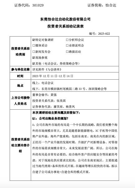 东莞怡合达自动化股份有限公司(以下简称“怡合达”或“公司”)12月15日晚间发布公告称,公司于近期接受了多家机构投资者的特定对象调研。在调研中,怡合达透露,公司定增项目已经深交所审核通过,目前处于等待证监会批复阶段。定增项目主要为增强FA工厂自动化零部件业务出货交付的供应链能力和自制生产能力,为下游市场需求增长做战略性部署,以满足市场需求和公司业务发展的需求,进一步提升公司的核心竞争力。