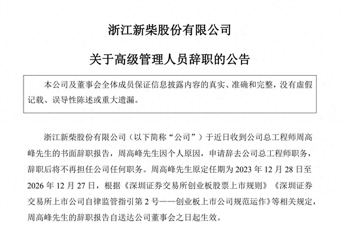 3月13日,新柴股份(SZ301032)公告,周高峰因个人原因,申请辞去公司总工程师职务,辞职后将不再担任公司任何职务。周高峰原定任期为2023年12月28日至2026年12月27日。
