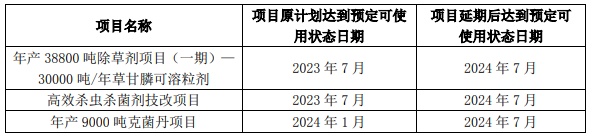 ″年产9000 吨克菌丹项目″于 2022 年 12 月取得环评手续,较原计划有所推迟,使得开工时间相应延迟,目前处于土建施工、设备订货阶段。另外公司对该项目的工艺设计进行一定的优化调整升级,部分装置、设备需要重新设计、选型,使得该项目进度放缓。经过审慎研究,公司决定将达到预计可使用状态时间调整为 2024 年 7 月。