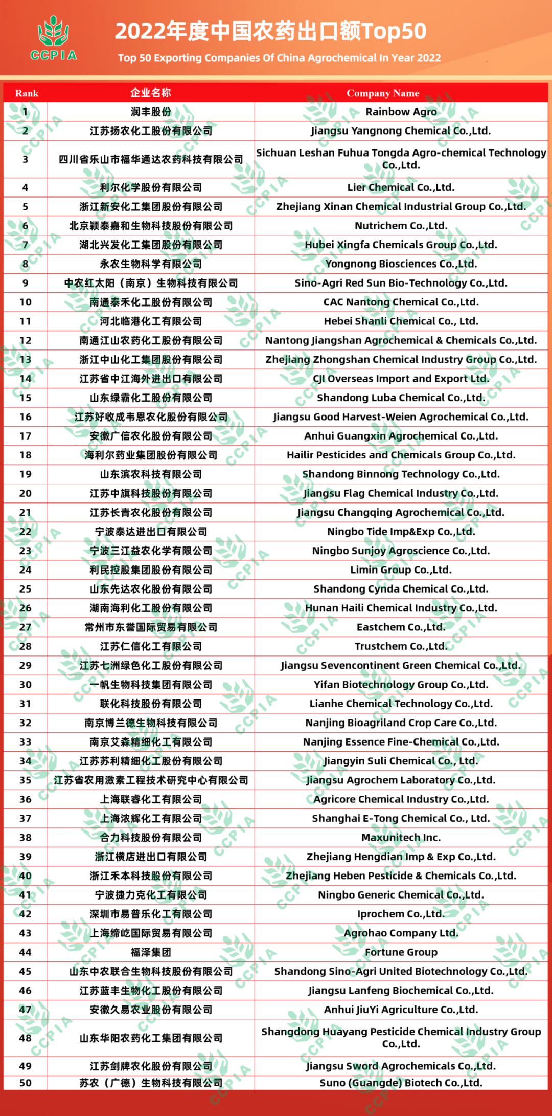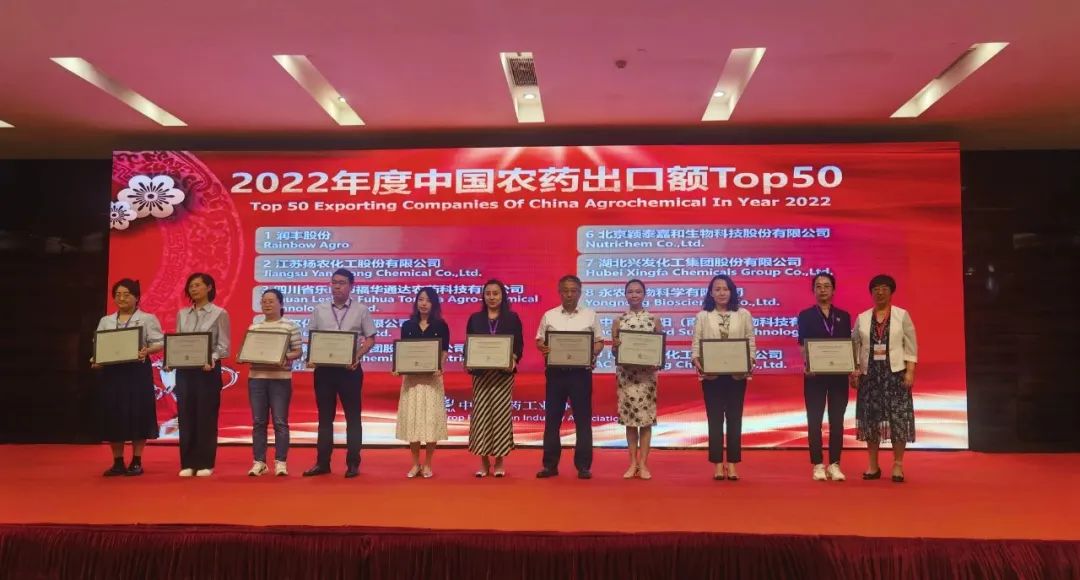 9月7日,在“第十届中国植物保护产品国际贸易发展论坛”上,中国农药工业协会国际贸易委员会发布2022年度“中国农药出口额Top 50”。公司再度获得“2022中国农药出口额TOP50”奖项,并持续荣膺第一。