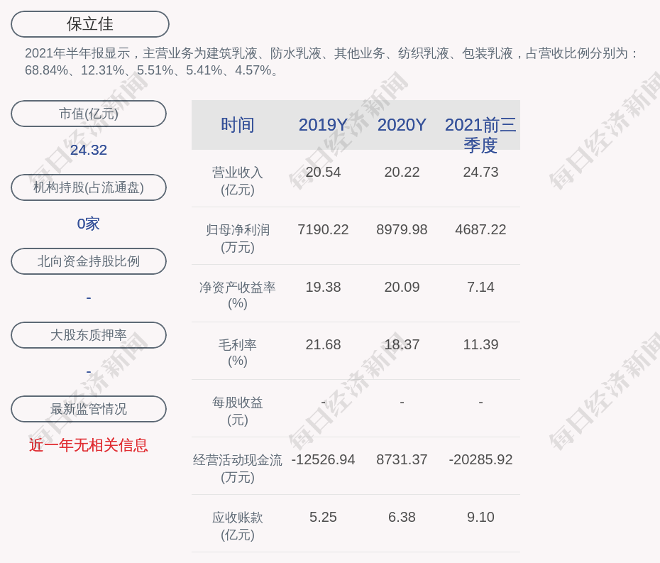 2021年半年报显示,保立佳的主营业务为建筑乳液、防水乳液、其他业务、纺织乳液、包装乳液,占营收比例分别为:68.84%、12.31%、5.51%、5.41%、4.57%。