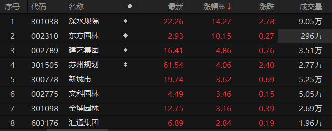 8月9日早盘,申万一级行业板块中,建筑装饰板块快速拉升。截至9时51分,东方园林涨停,深水规院涨逾14%,苏州规划、建艺集团涨逾4%,新城市等跟涨。