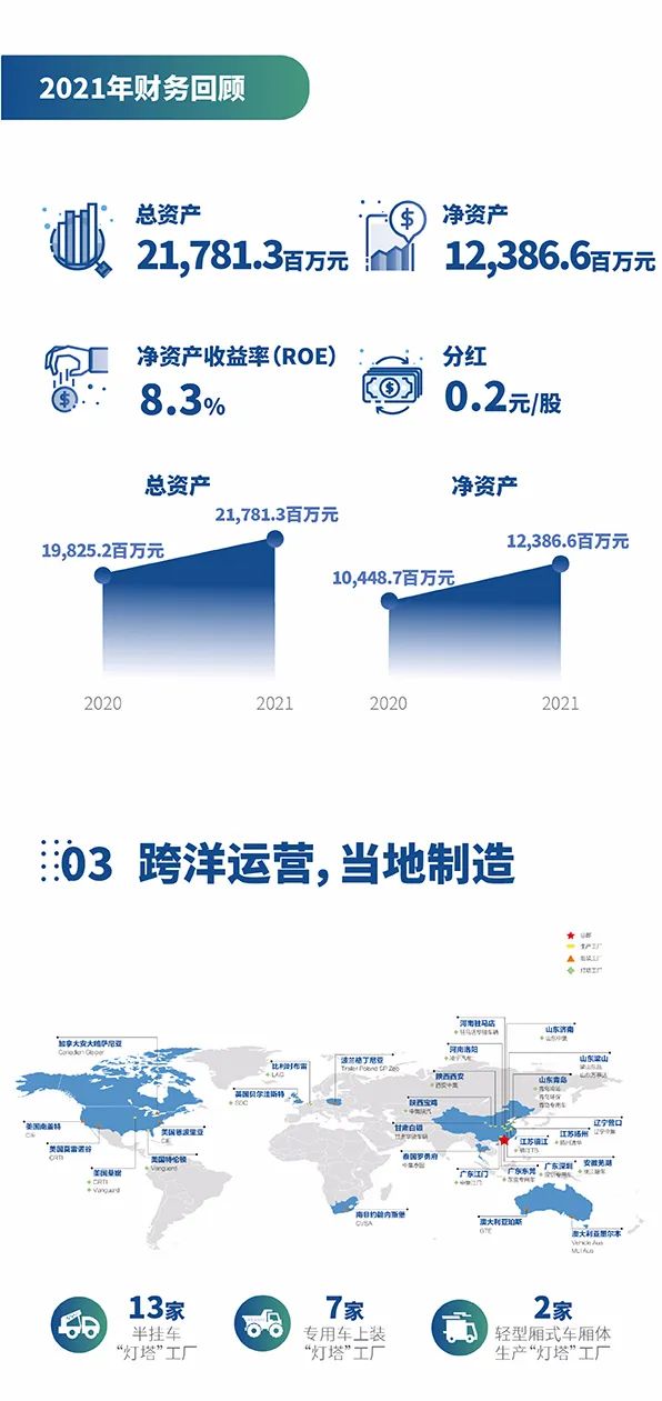 年报显示,中集车辆2021年营业收入276.5亿元,同比增长4.3%;实现净利润9.9亿元;总资产与净资产分别达到217.8亿元及123.9亿元,同比分别增长9.9%与18.5%;每股收益0.48元。同时,中集车辆拟向全体股东每10股派发现金股利2元(含税)。