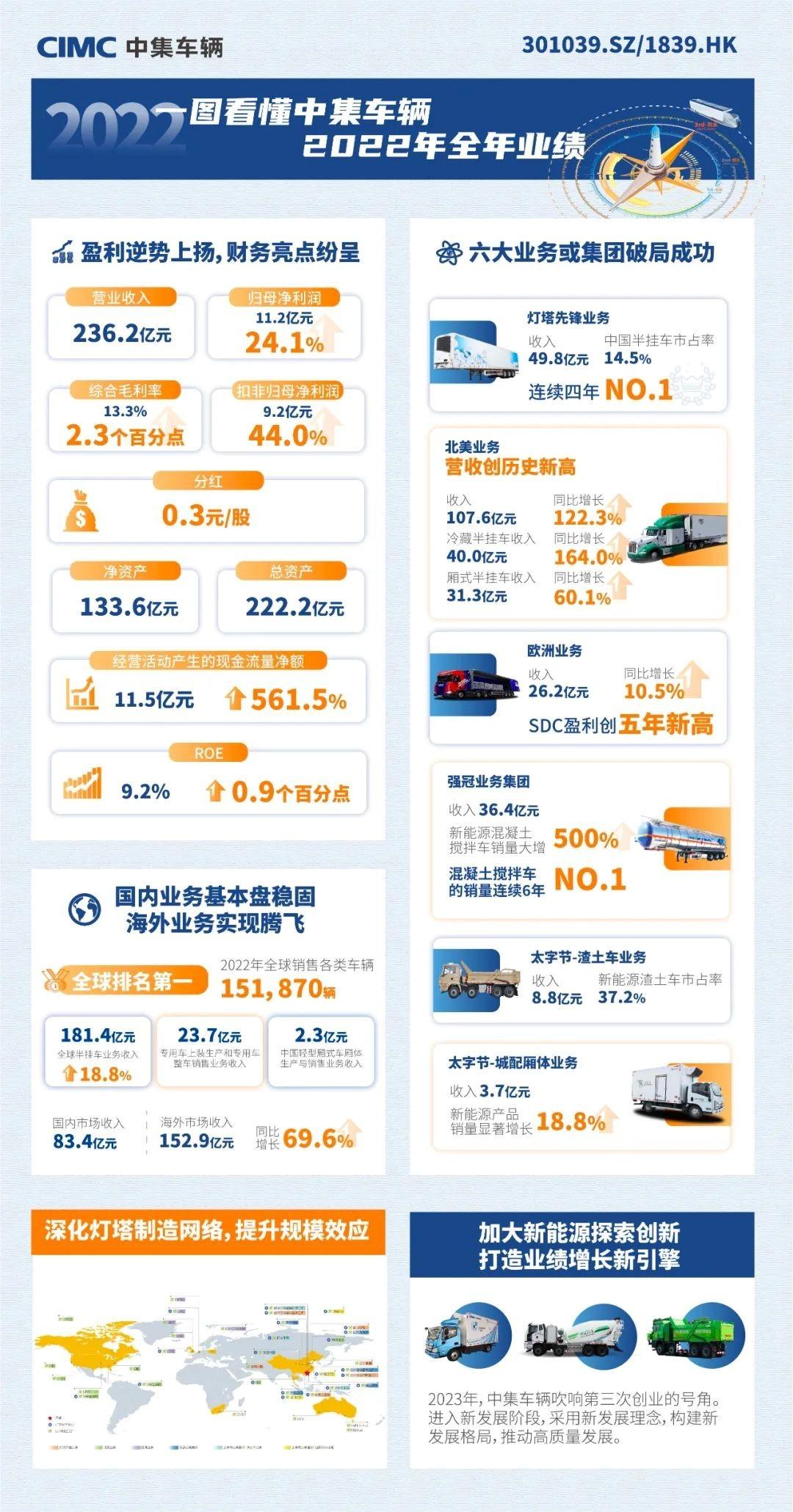 2022年面对整体经济下行、专用车行业低迷等挑战,中集车辆践行“灯塔制造网络”战略,整合优势资源,逆势破局成功,六大业务或集团协同发展,在全球销售各类车辆合计15.19万辆,海外市场收入大涨69.65%。