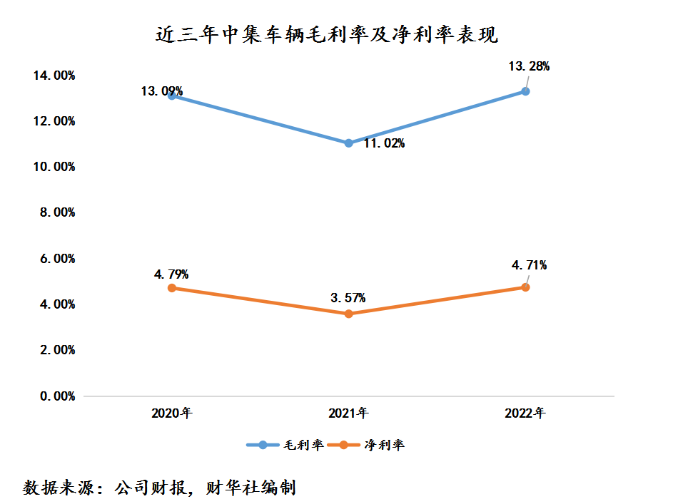2022年,中集车辆毛利率为13.28%,同比提升了2.26个百分点,净利率为4.71%,同比提升了1.14个百分点。其中,毛利率及净利率均为近两年的高点。