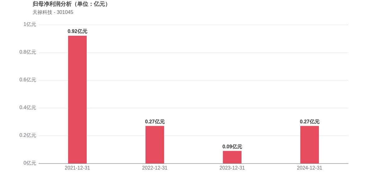 利润角度分析,2021年天禄科技实现归母净利润0.92亿元,2024年0.27亿元。公司盈利能力在2022年和2023年大幅下滑,2024年实现206.84%的大幅反弹。