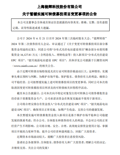 能辉科技表示,由于近期可转债市场特别是光伏行业可转债价格波动巨大,这种情形,实属事先难以预料与判断,为维护市场平稳,保护股东、债券持有人的利益,确保公司平稳经营,公司拟暂缓实施上述可转债募投项目的变更事项,同时公司本次将取消因变更可转债募投项目所涉及的可转债相关回售程序活动。