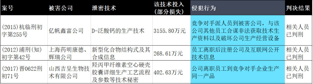 通过知产宝法律文书数据检索,找到三件与义翘神州公司最密切相关的商业秘密案件,此三篇均为刑事案件,案由均为“侵犯商业秘密罪”,其侵权行为分别为竞争对手派人员到被害公司非法获取技术信息、离职员工网上公开核心技术信息、离职员工跳槽到竞争对手企业,其造成的最小损失分别达到了3155.80万元、268.61万元、402.63万元,对于该公司发展产生巨大的影响。
