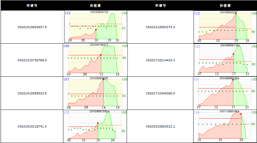 备注:价值谱横坐标轴表示年份时间轴,左纵轴为专利数,右纵轴为相关度,折线对应专利数量;红色面积表示申请日前高相关度专利数量,绿色面积表示申请日后高相关度专利数量;红色横线为申请日前平均相关度,黄色横线为申请日后平均相关度;高相关度专利选取条件:一是相关度大于70%以上的;二是需在最相关800件专利以内。